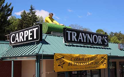 Everyone knows Traynor’s Floors & Carpet, it’s the place you pass daily in Westminster, MD, with the man on the roof. Possibly the best known guy in town is Roland, the 10 ft tall man on the roof pushing the carpet. See some of Roland’s fun looks over the years in our special 50th Anniversary article.